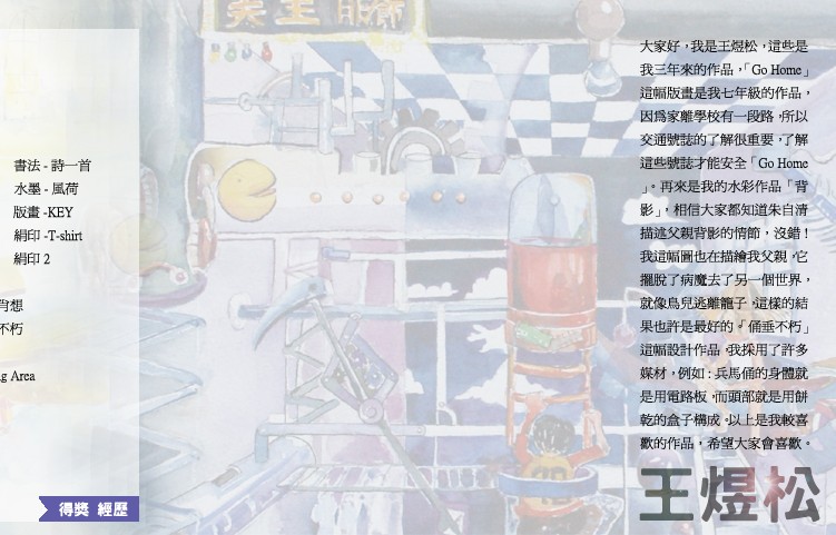 98學年度全國學生美展縣賽漫畫類-第一名、98學年度全國學生美展縣賽平面設計-第一名、97學年度校內國語文競賽-第一名﹝寫字類﹞